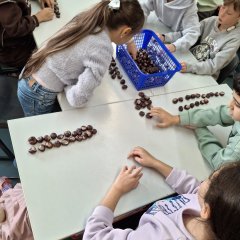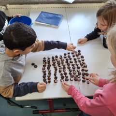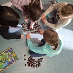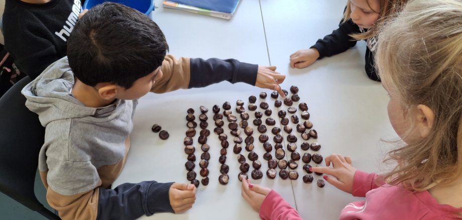 Nach den Herbstferien brachten die Klassenlehrkräfte der dritten Klassen auf einmal ganz viele Kastanien mit in die Klasse. - "Wie viele sind das?" und "Wie kann man das geschickt herausfinden?"
