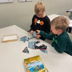 Wir waren heute in der Bücherei und waren ganz aufgeregt, weil wir uns zum ersten Mal Bücher ausleihen durften. Vorher haben wir uns aber erstmal versammelt und haben eine Einweisung in die Bücherei bekommen, damit wir auch selber Bücher finden können, die uns gefallen und für unser Alter geeignet sind. Dann haben wir noch ein Buchcover zusammengepuzzelt und eine tolle Geschichte von „Knolle Murphy“ angefangen. Dann durften wir endlich in der Kinderecke stöbern und unser erstes Buch ausleihen. Wir freuen uns schon auf unseren nächsten Besuch und sind gespannt wie die Geschichte um „Knolle Murphy“ weitergeht.